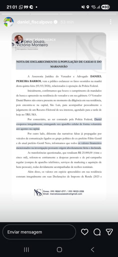 A reação também veio por meio da defesa do vereador. O advogado Marcelo Souza divulgou uma nota na qual afirma causar “estranheza” o fato de a operação ocorrer justamente no dia em que Daniel Barros acompanharia um julgamento na Justiça Eleitoral. A declaração, no entanto, foi interpretada por muitos como uma tentativa de desmoralizar a atuação da Polícia Federal.