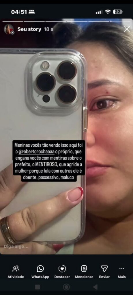 Em um story publicado no Instagram, a mulher exibiu uma marca no rosto e afirmou que foi agredida por Roberto Rocha. Na publicação, ela relata comportamento “possessivo, doentio e mentiroso”, apontando que ele teria crises de ciúmes e um histórico de comportamento agressivo.